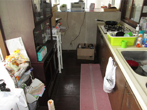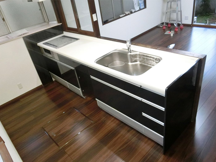 ステンレスキャビネットのキッチンと、椅子を収納できるスペースをつくったところ。